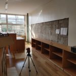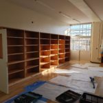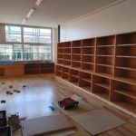 既存の家具撤去後の据付で、壁は元家具の形でコンクリートが窪んでいます。